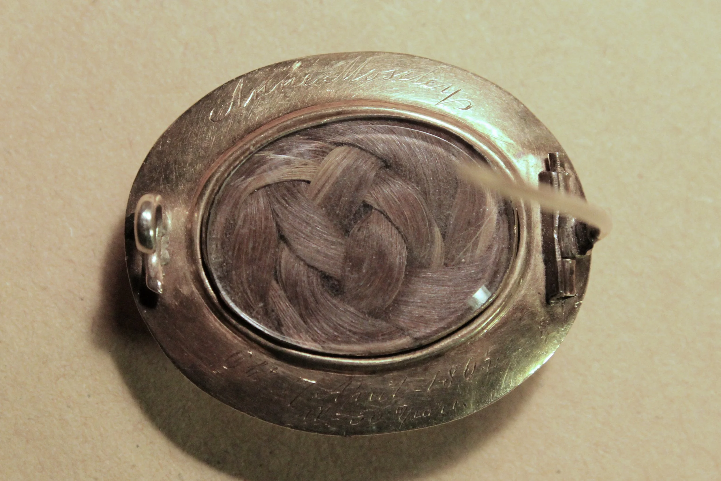 Among the items was an elliptical engraved gold brooch, with a central raised Aquamarine stone, which appeared to be a mourning brooch marking the passing of a lady named Anne Moseley in 1865. What was interesting about it was that it had plaits of brown/auburn (presumably Anne's) hair incorporated into the body which could be viewed through a glass window on the reverse and with engraved inscriptions above and below the window, which read;