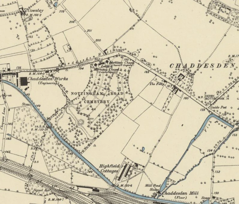 Historical map showing Chaddesden area with landmarks like Chaddesden Works, Nottingham Road Cemetery, Chaddesden Mill, and Highfield Cottages, with a river passing through.