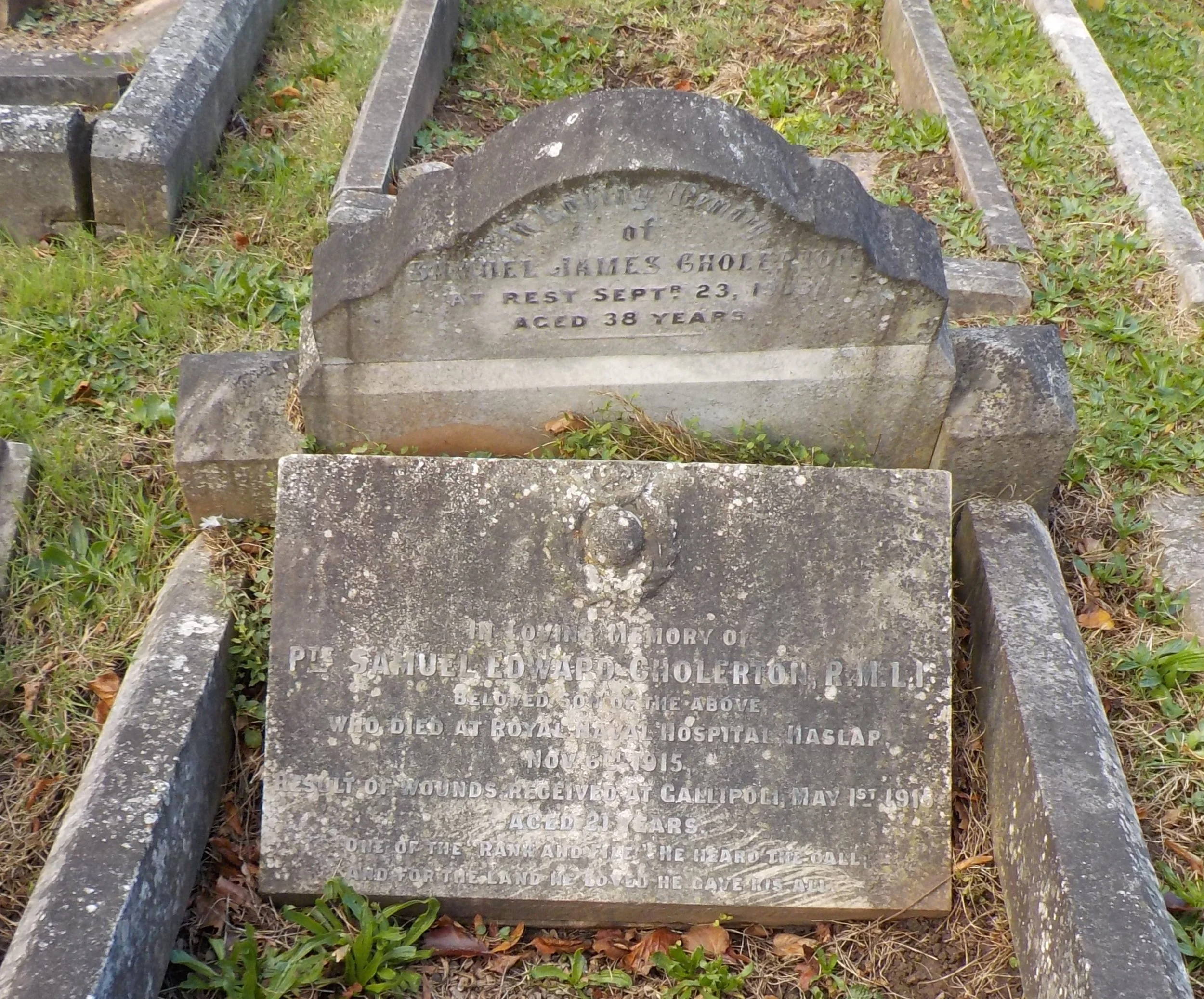 Died 06/11/1915, Haslar Hospital, Gosport, Age 21. Private, Royal Marine Light Infantry, Portsmouth Bn. R.N. Div. Service Number PO/580(S). Son of Lavinia Blanche Cholerton, of 57, Crompton St., Derby, and the late Samuel James Cholerton.