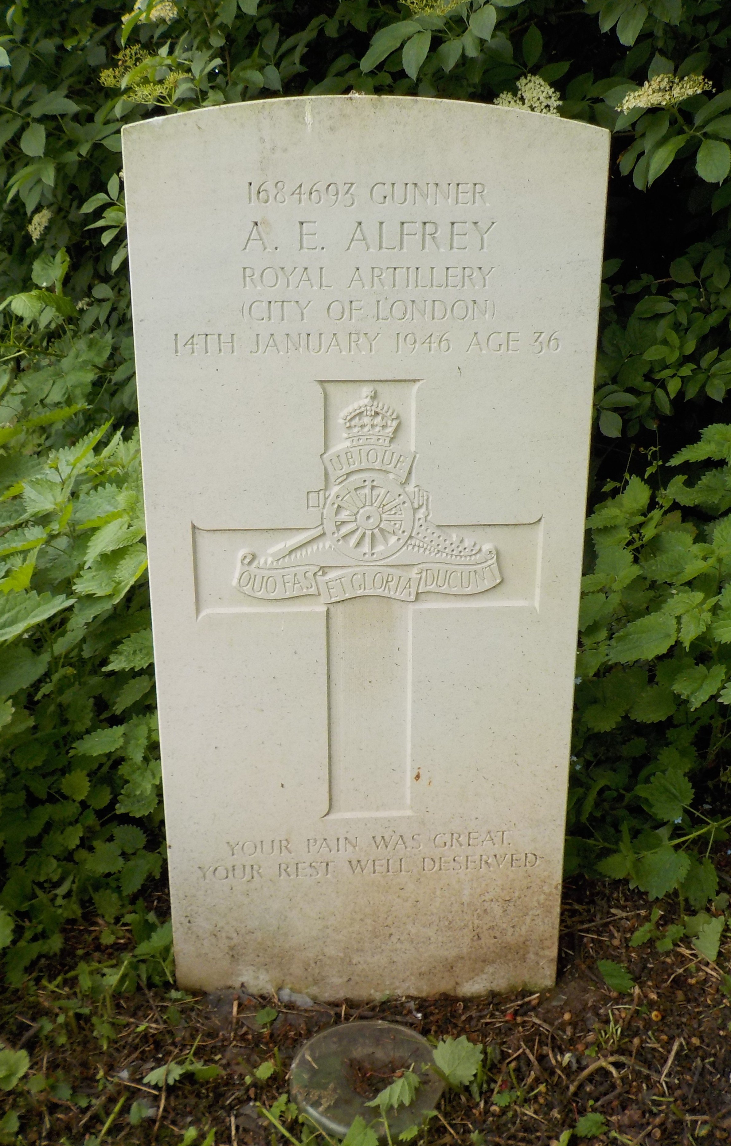Died 14/01/1946, Derby Borough Isolation Hospital. Age 36. Gunner, Royal Artillery, 168 Bty. 60 (4th Bn. City of London Regt.) H.A.A. Regt. Service Number 1684693. Son of Edward and Maud Alfrey, of Derby; husband of Catherine Alfrey, of Derby.