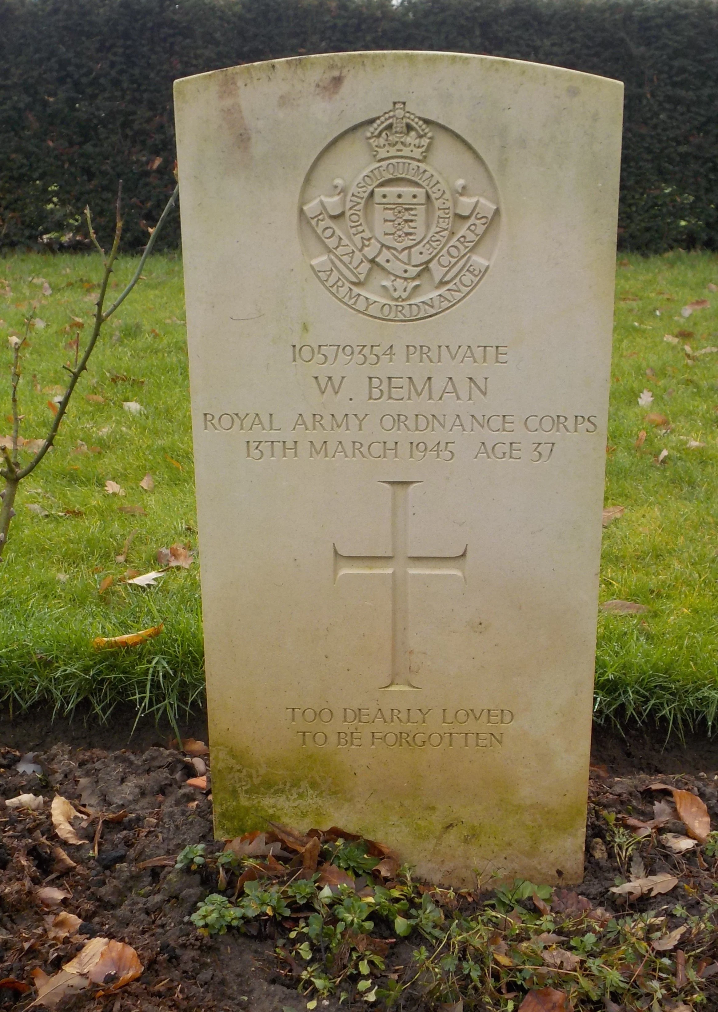 Died 13/03/1945 Age 37. Private, Royal Army Ordnance Corps, Service Number 10579354. Son of Harry and Agnes Beman, of Leeds, Yorkshire; husband of Mary Althea Beman, of Leeds.