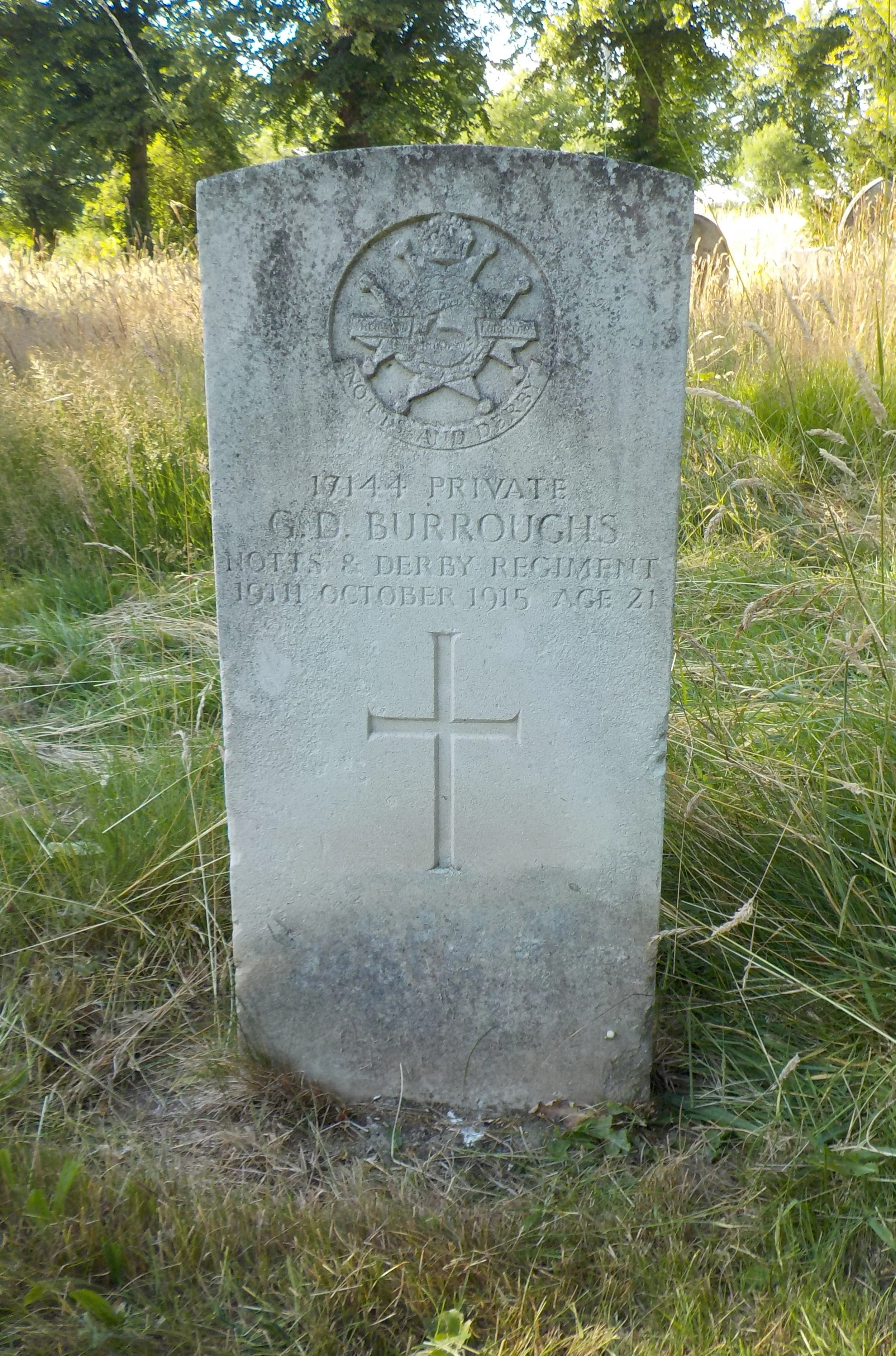 Died 19/10/1915, 23 Sacheveral Street, Derby, Age 21. Private, Sherwood Foresters (Notts and Derby Regiment), 10th Bn. Service Number 17144. Son of Catherine Hunter (formerly Burroughs), of 23, Sacheverel St., Derby, and the late George Newman Burroughs.