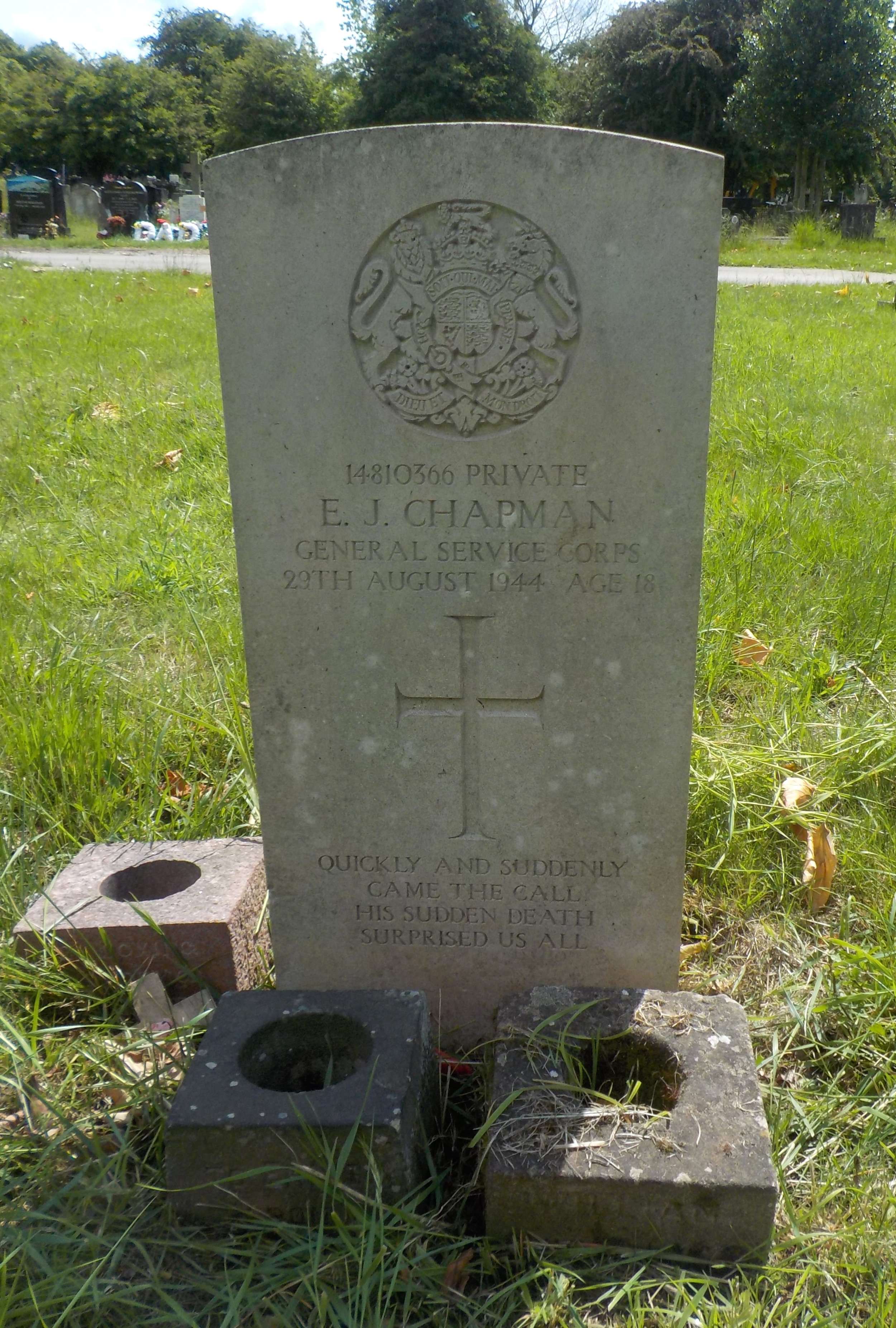 Died 29/08/1944 Age 18. Private, General Service Corps, Service Number 14810366. Son of Ernest Ephraim and Susan Ann Chapman, of Derby.