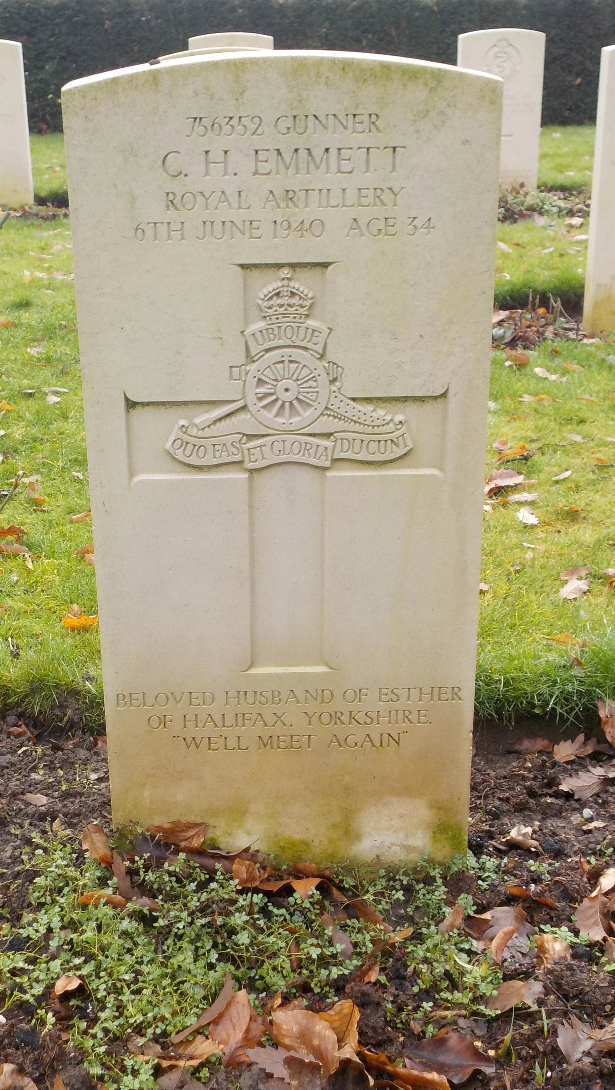 Died 06/06/1940 Age 34. Gunner, Royal Artillery, 271 Bty., 68 Anti-Tank Regt. Service Number 756352. Son of Willie Emmett and of Kate Emmett (nee Swift), of Halifax, Yorkshire husband of Esther Emmett, of Siddal, Halifax.