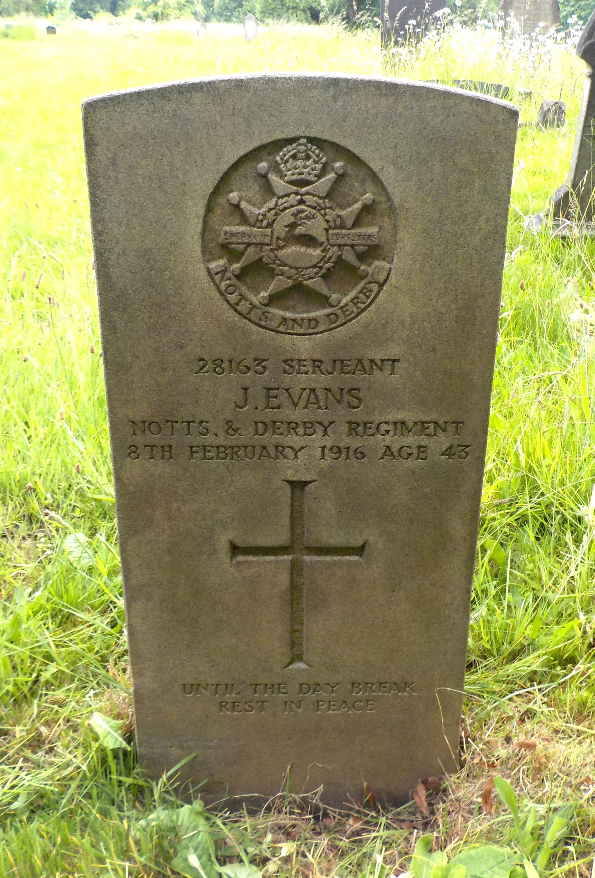 Died 08/02/1916 Age 43. Serjeant, Sherwood Foresters (Notts and Derby Regiment), 3rd Bn. Service Number 28163. Husband of Catherine Ann Evans, of Western Drive, Littleover, Derby.
