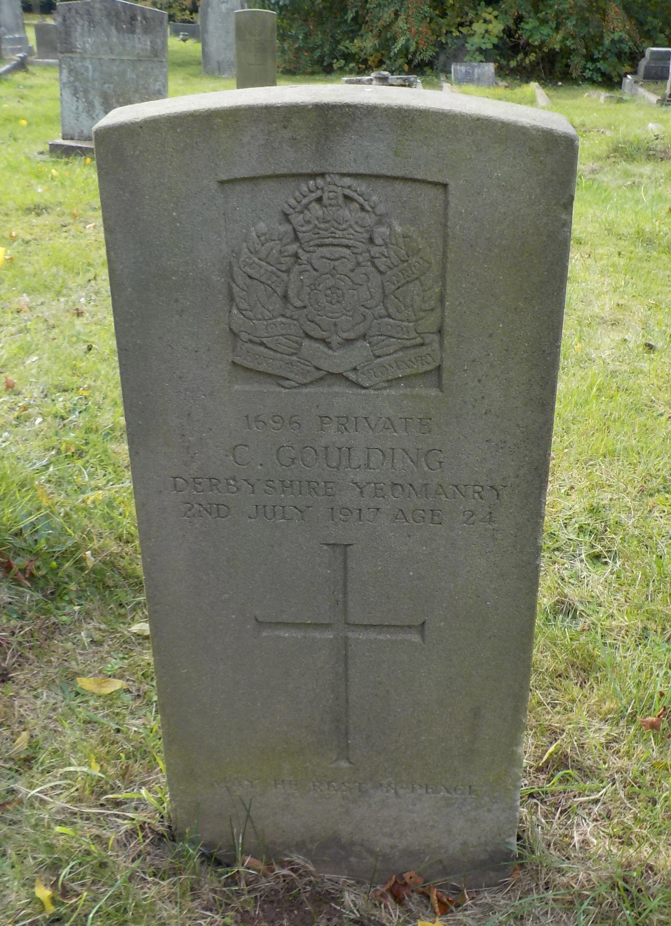 Died 02/07/1917 Age 24. Private, Derbyshire Yeomanry, Service Number 1696. Son of James and Bridget Goulding of 205, Harrington St., Derby. Born at Colchester.