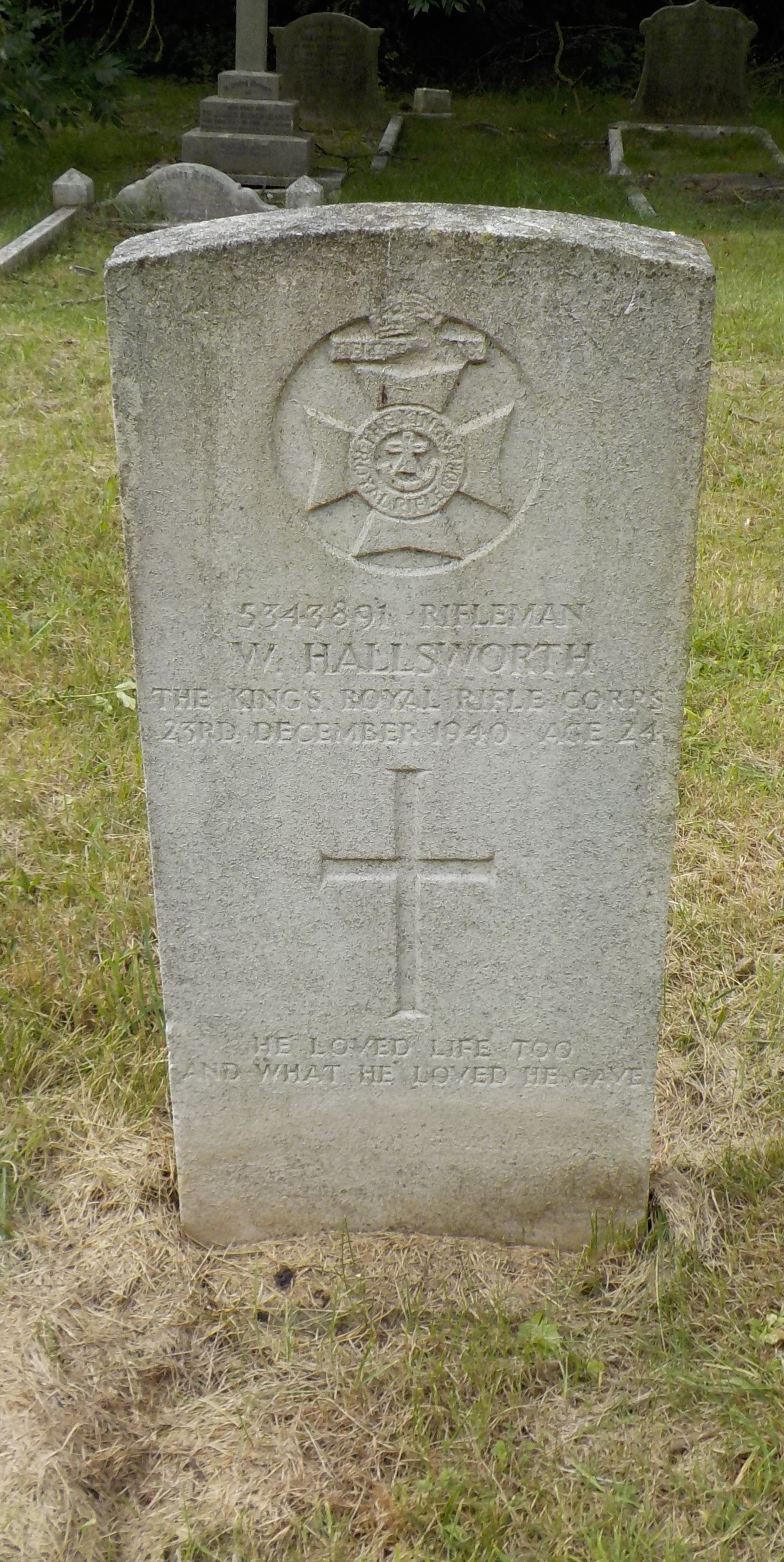 Died 23/12/1940 Age 24. Rifleman, King's Royal Rifle Corps, 7th (H.D.) Bn. Service Number 5343891. Son of George and Lilian Hallsworth, of Derby; husband of F. M. Hallsworth, of Duffield.
