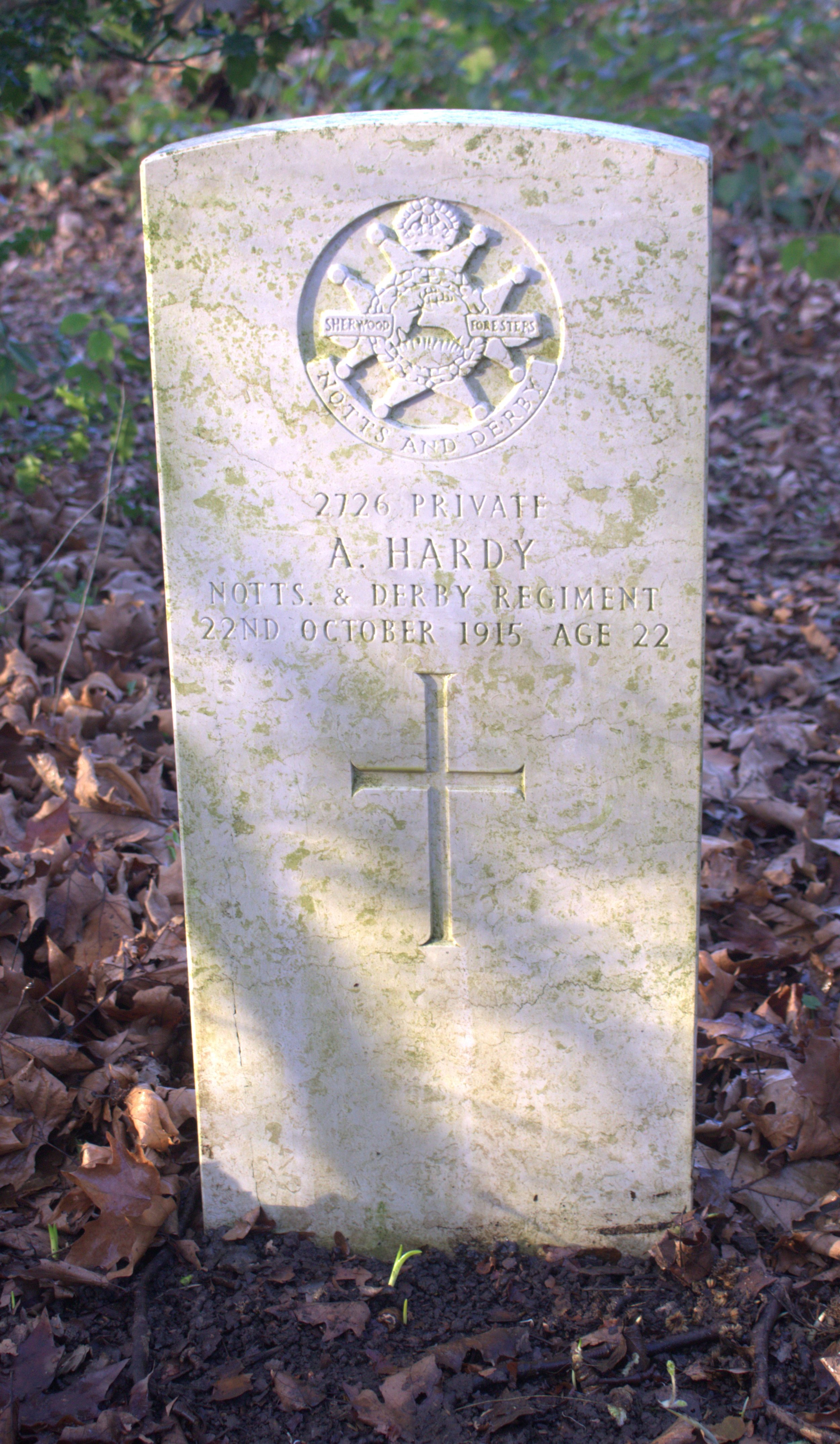Died 22/10/1915 Age 22. Private, Sherwood Foresters (Notts and Derby Regiment), 1st/5th Bn. Service Number 2726. Son of Frederick and Jane Hardy, of 82, Almond St., Derby.