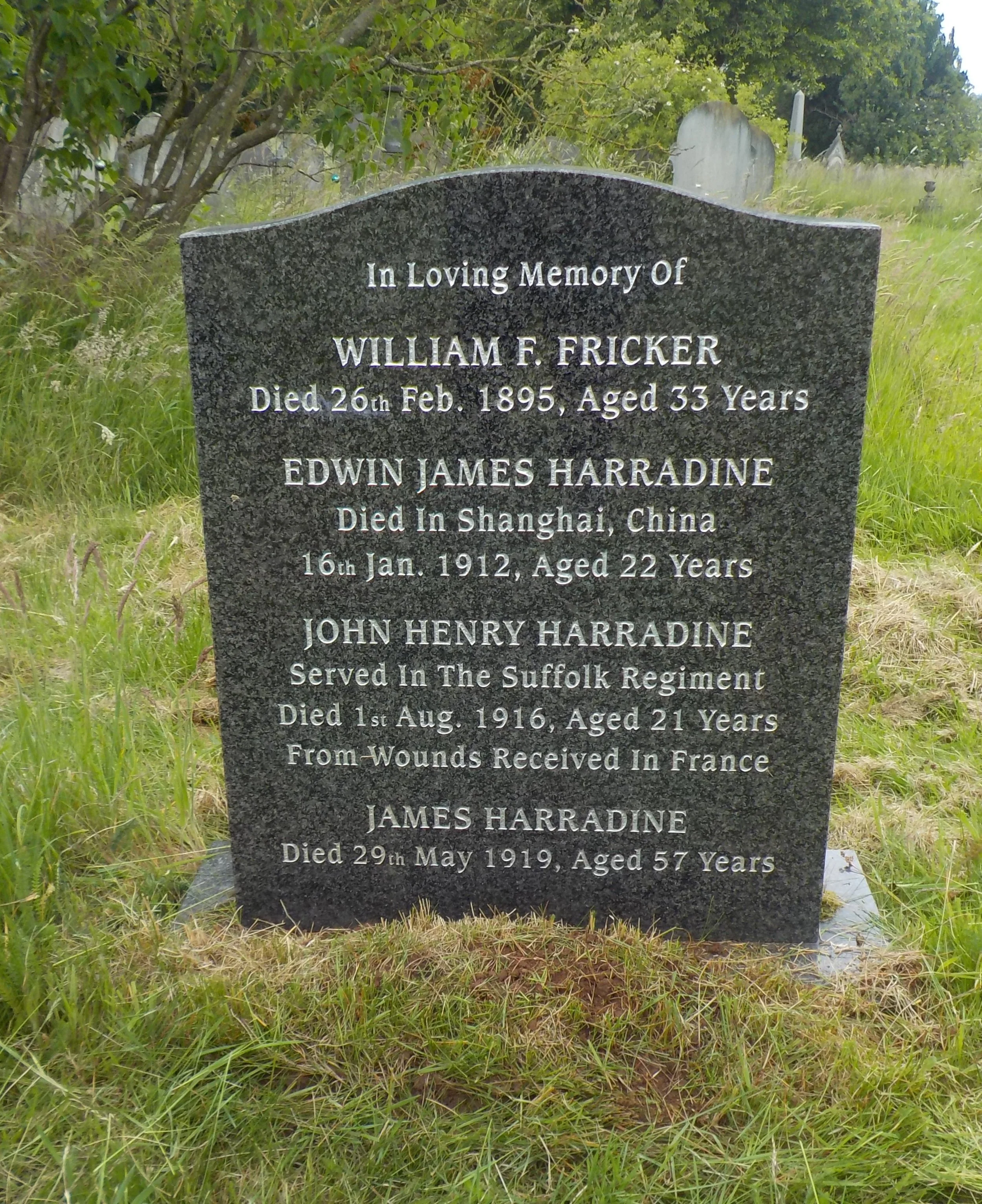 Died 01/08/1916 Age 21. Private, Suffolk Regiment, 2nd Bn. Service Number 19241. Son of James and Ellen Harradine, of 108, Bole Hill, Wirksworth, Derby.