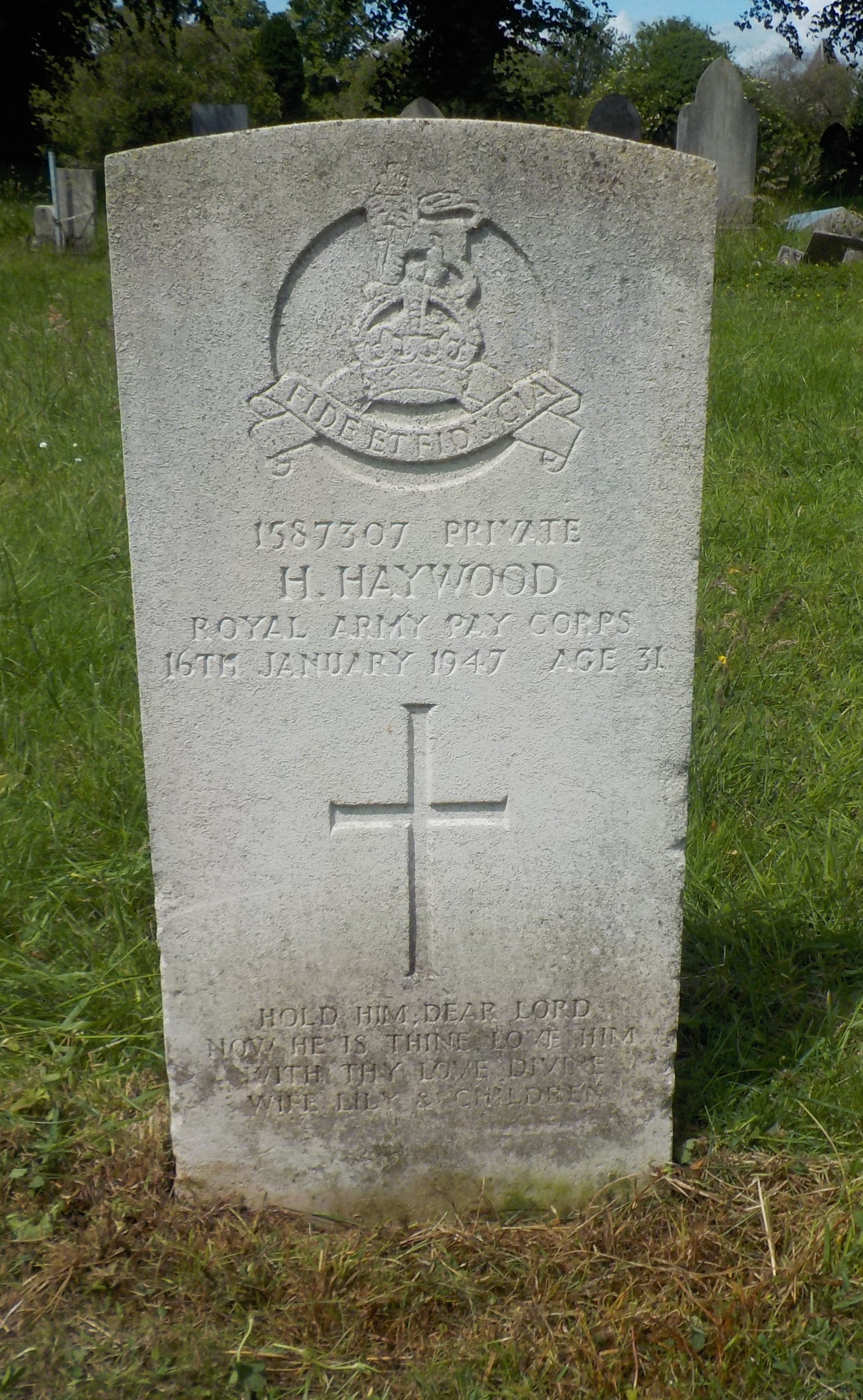 Died 16/01/1947 Age 31. Private, Royal Army Pay Corps, Service Number 1587307. Son of Arthur Joseph and Eliza Haywood; husband of Lily Haywood, of Derby.