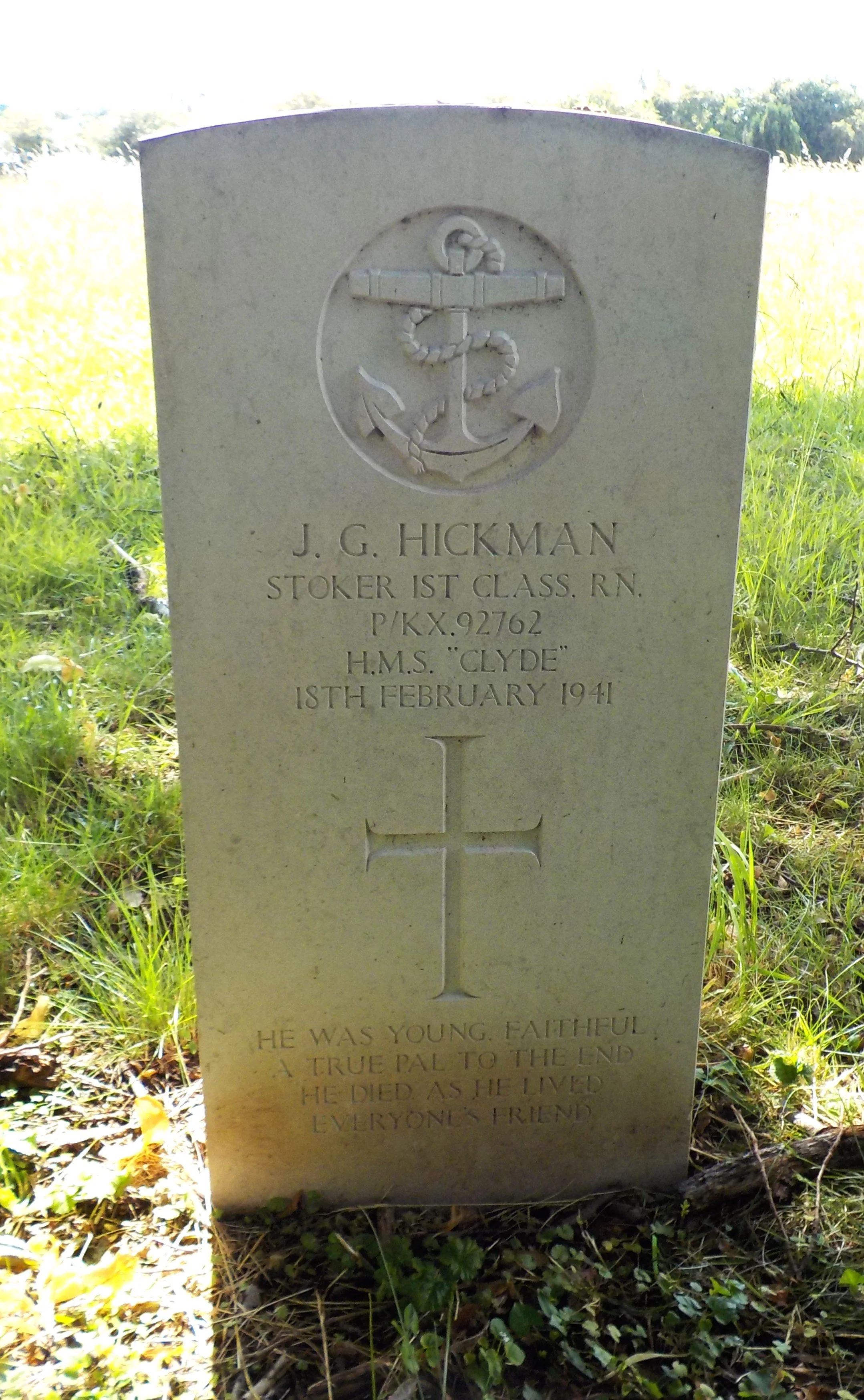 Died 18/02/1941 Age 21. Stoker 1st Class, Royal Navy, H.M.S. Clyde. Service Number P/KX 92762. Son of George Henry and Hilda Ethel Hickman, of St. Peter Port, Guernsey, Channel Islands.