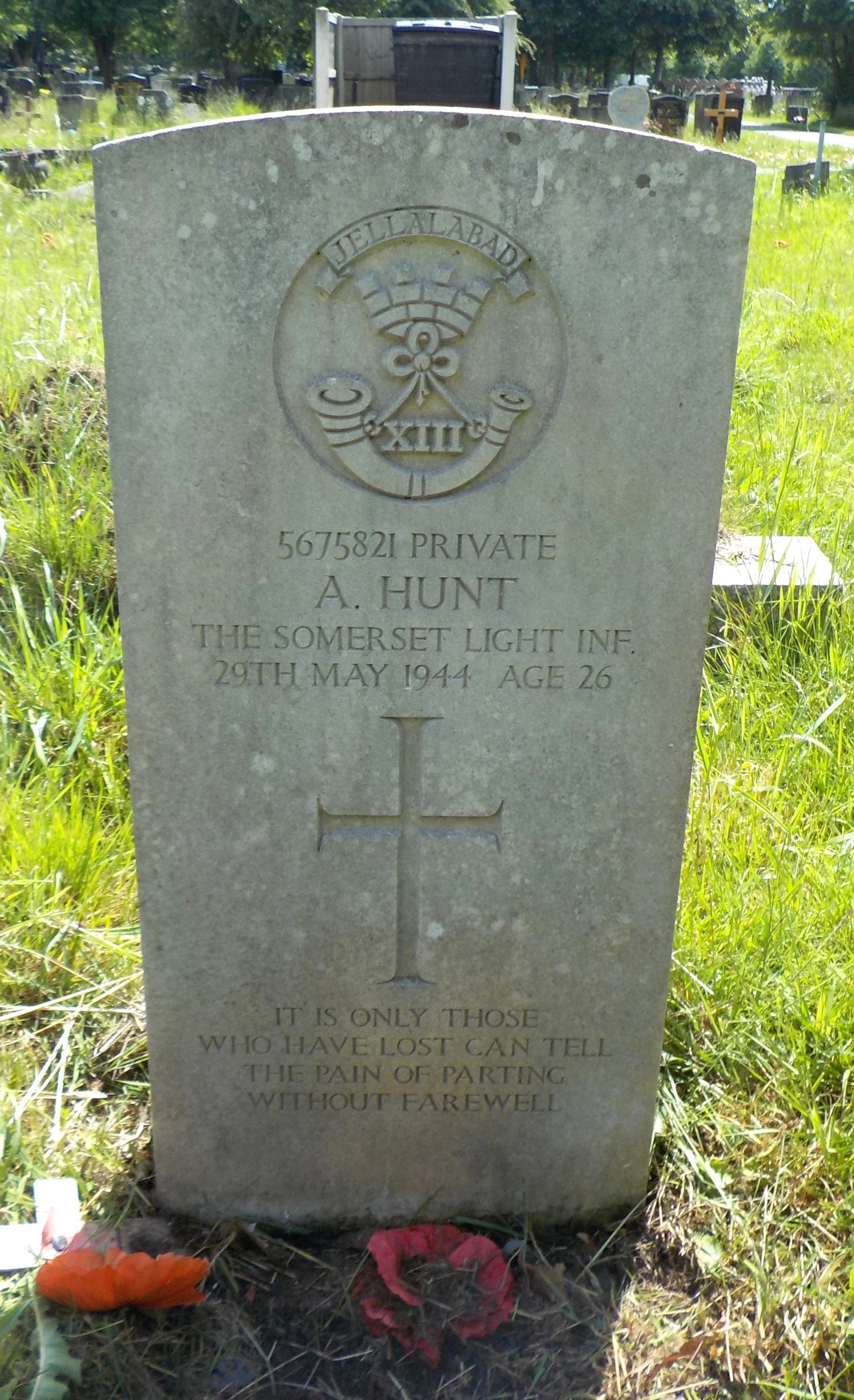 Died 29/05/1944 Age 26. Private, Somerset Light Infantry, 4th Bn. Service Number 5675821. Son of David and Annie Hunt; husband of Gwendoline Hunt, of Derby.