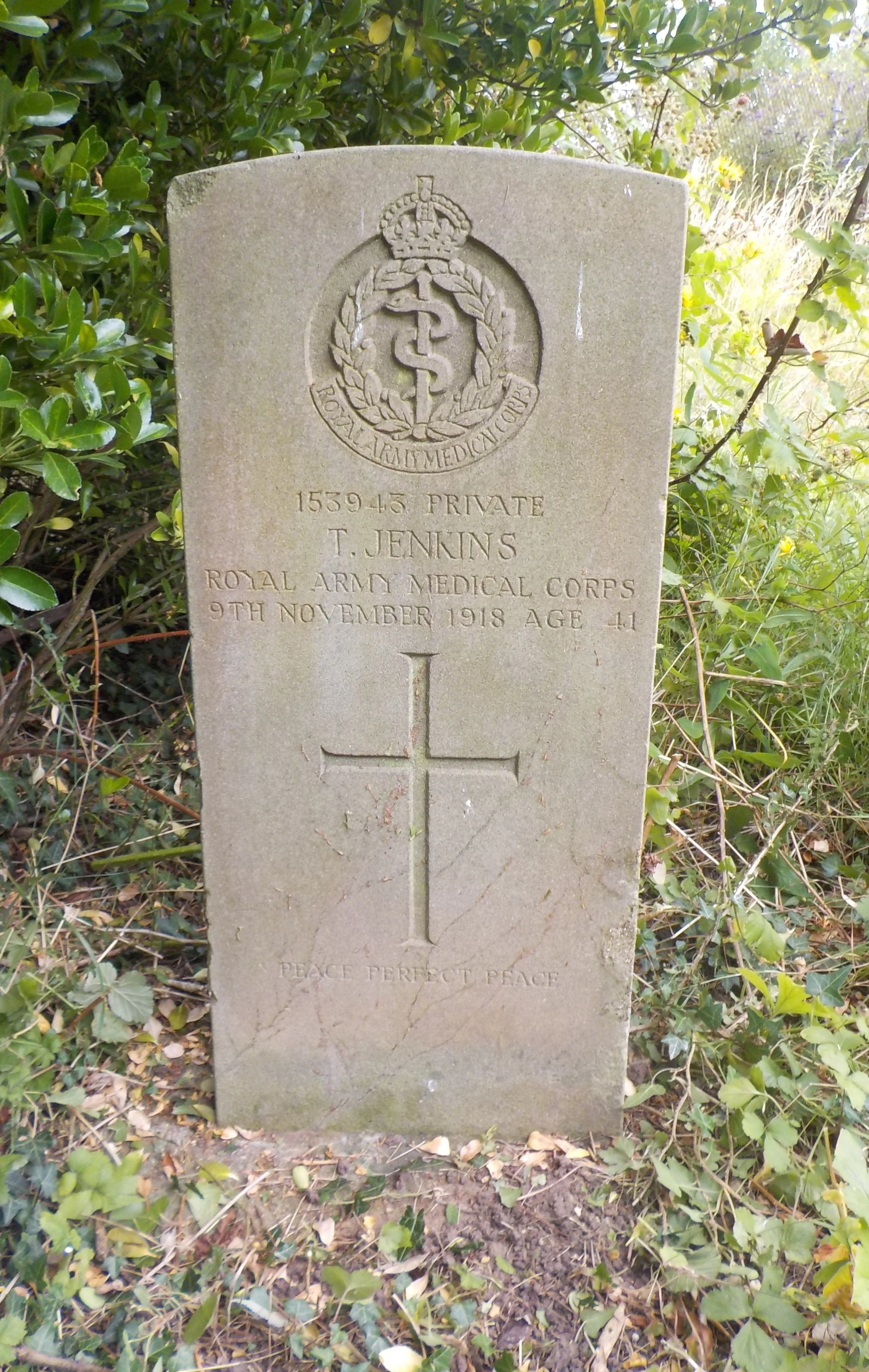 Died 09/11/1918 Age 41. Private, Royal Army Medical Corps, Service Number 153943. Husband of Alice Jenkins, of 73, Moss St., Derby.