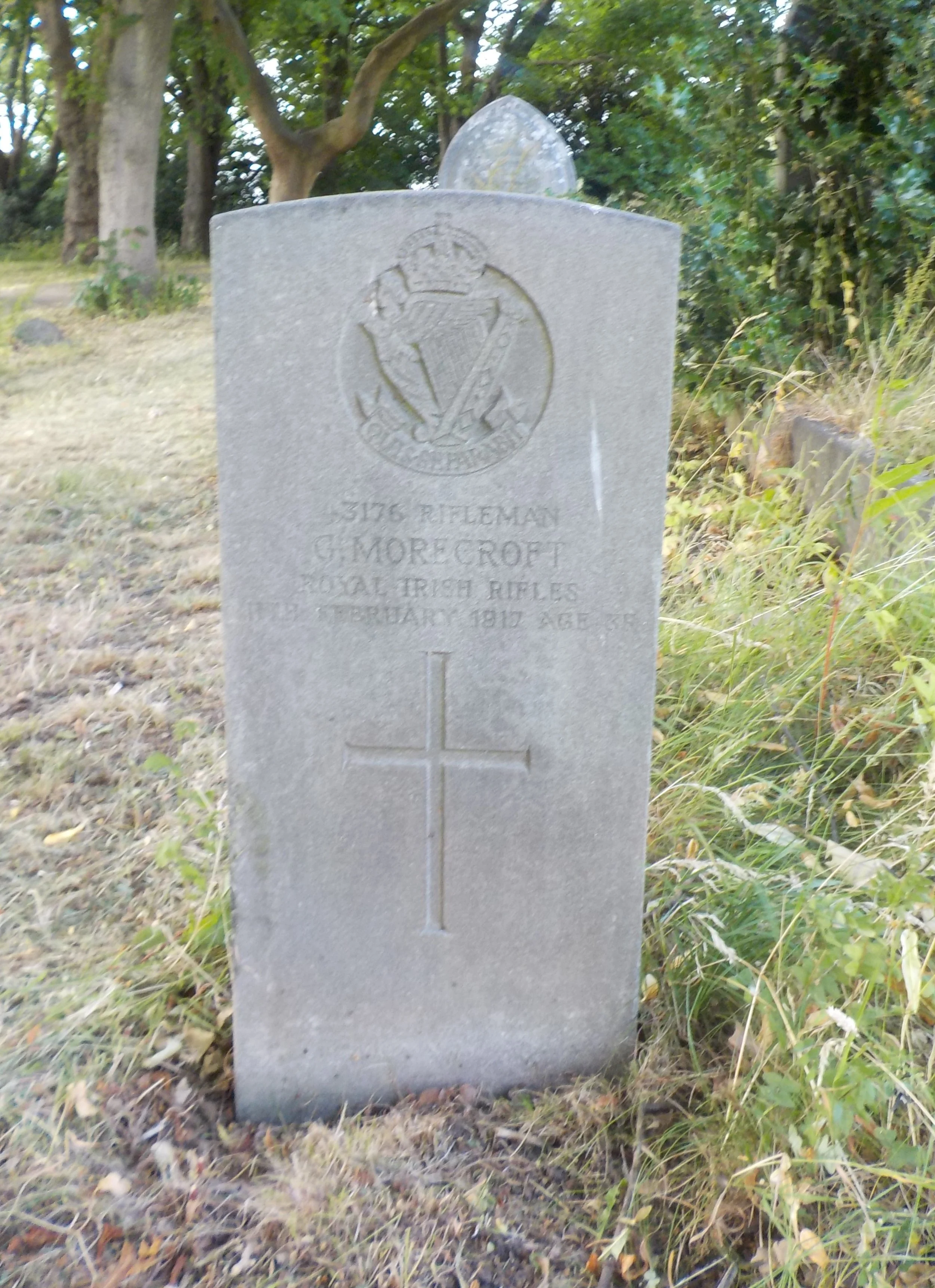 Died 11/02/1917 Age 35. Rifleman, Royal Irish Rifles, 13th Bn. Service Number 43176. Son of George Morecroft; husband of Mary Morecroft, of 18, Eley St., Derby.