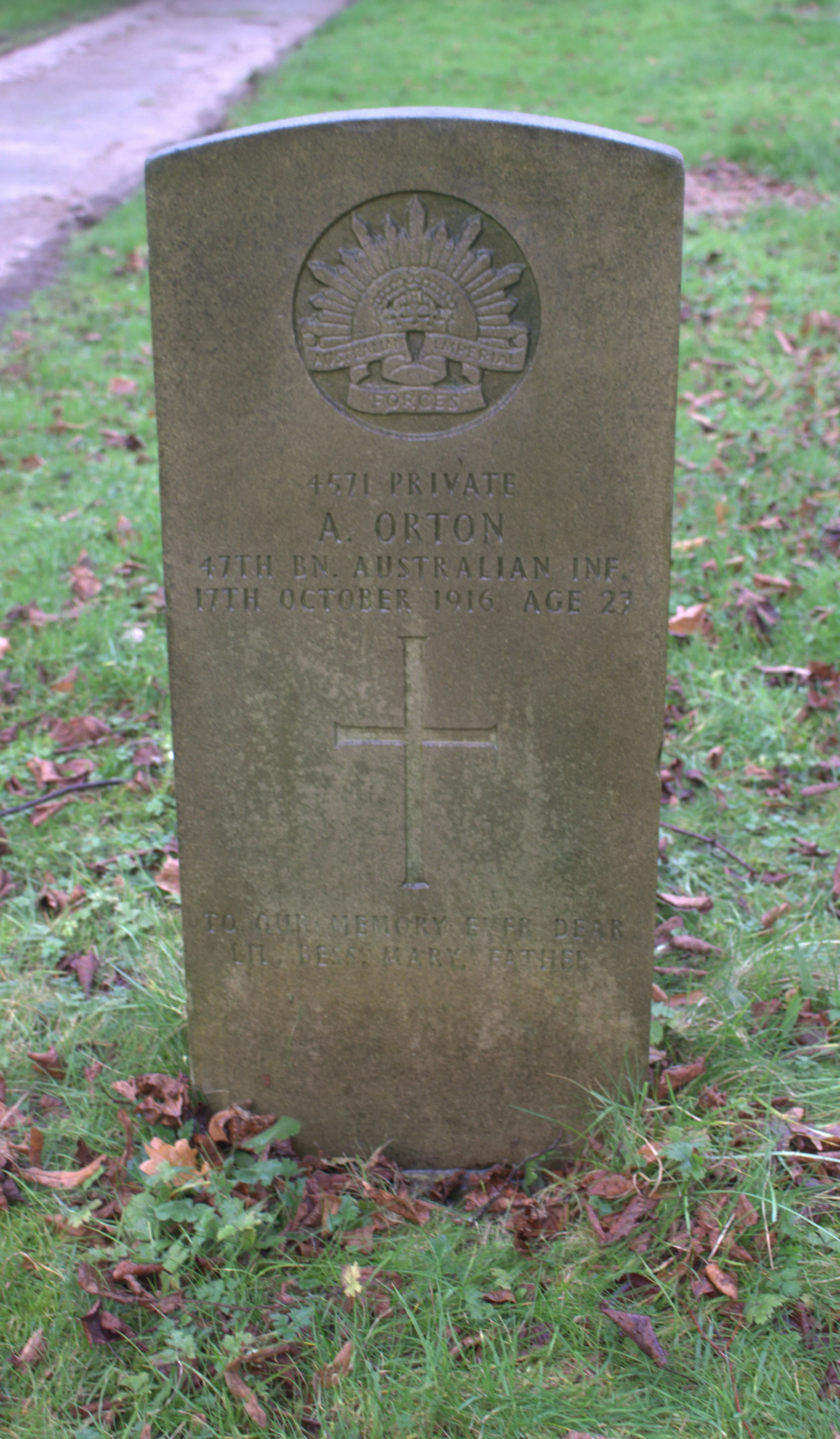 Died 17/10/1916 Age 27. Private, Australian Infantry, A.I.F., 47th Bn. Service Number 4571. Son of John and Elizabeth Orton, of Salisbury, Queensland. Born at Brisbane.
