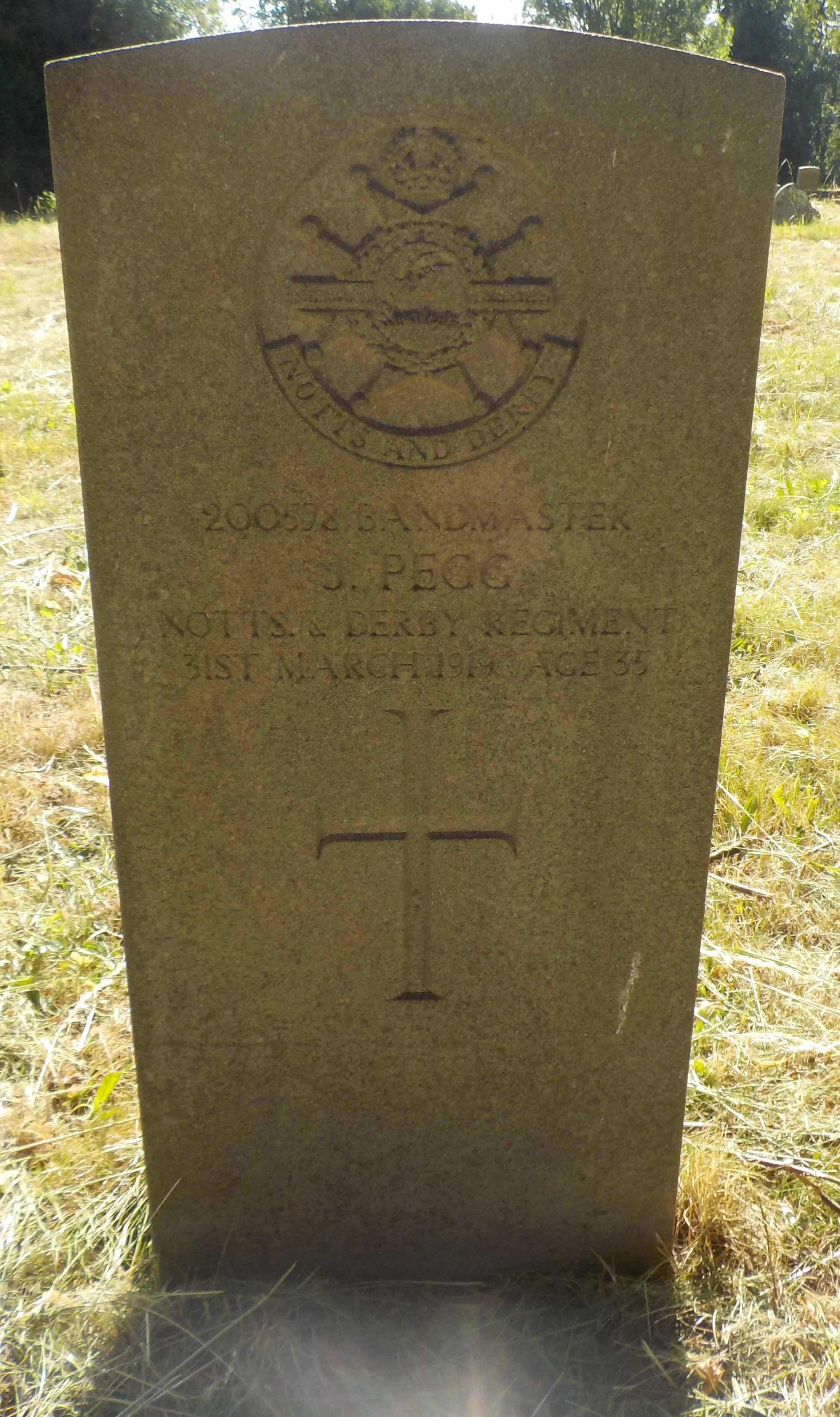 Died 31/03/1919 Age 35. Bandmaster, Sherwood Foresters (Notts and Derby Regiment), 1st/5th Bn. Service Number 200578. Son of James and Mary Ann Pegg. Born at Derby.