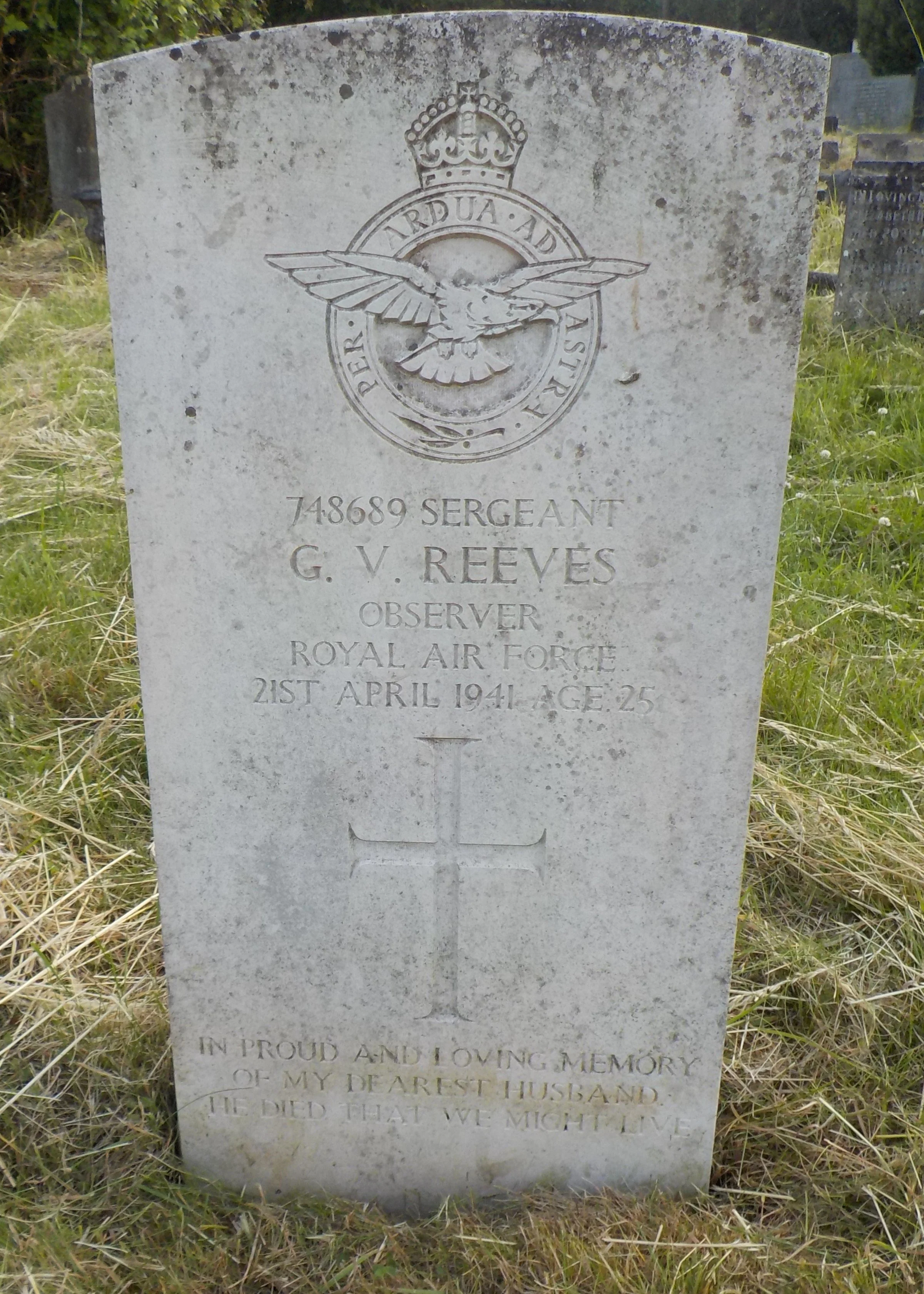 Died 21/04/1941 Age 25. Sergeant, Royal Air Force Volunteer Reserve, 206 Sqdn. Service Number 748689. Son of Thomas John and Kate Reeves, of Derby; husband of Joyce Reeves, of Derby.