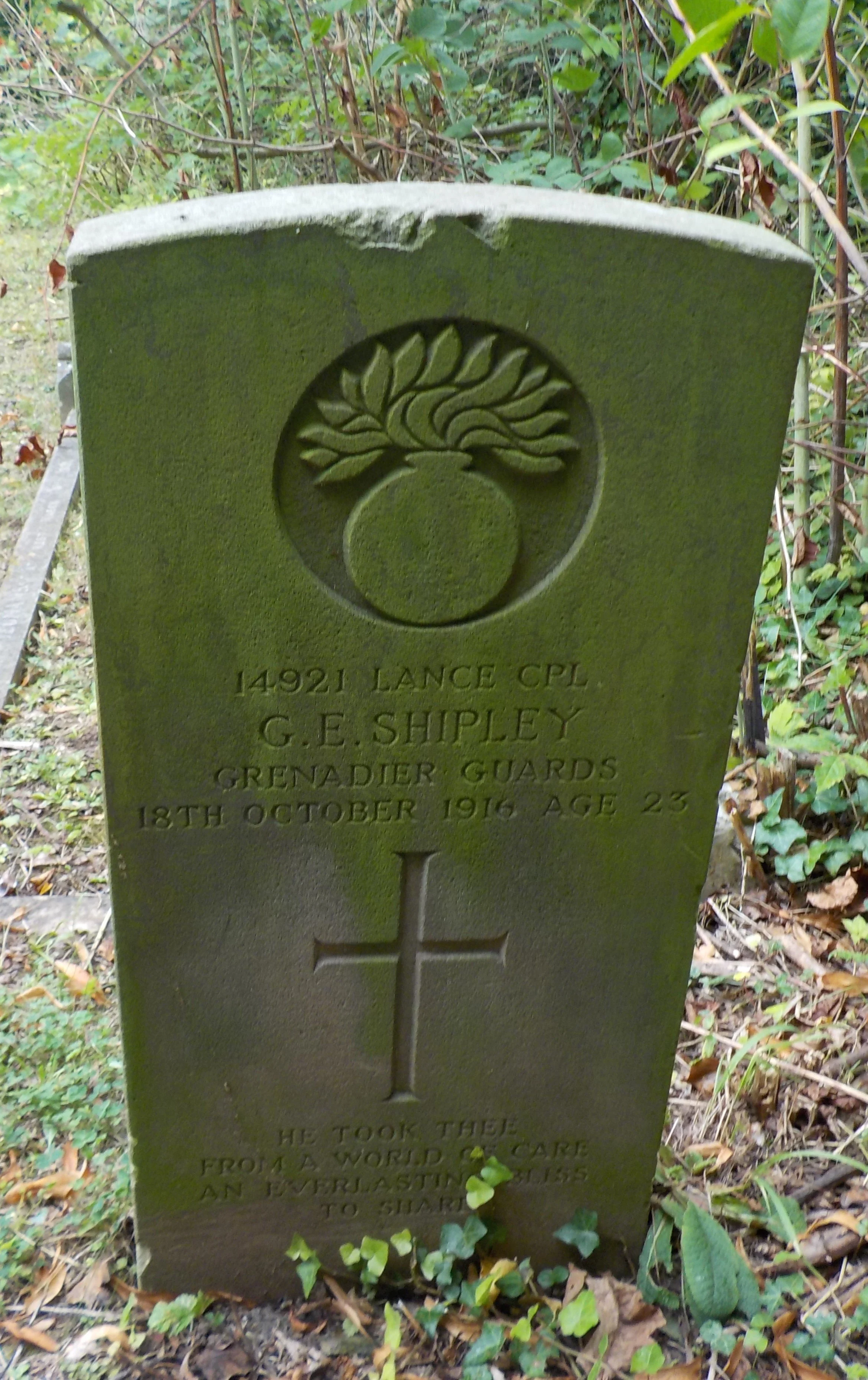 Died 18/10/1916 Age 23. Lance Corporal, Grenadier Guards, 5th Bn. Service Number 14921. Son of George and Gertrude B. Shipley, of 616, Cuvillier St., Hochelaga, Montreal, Canada. Born at Derby.