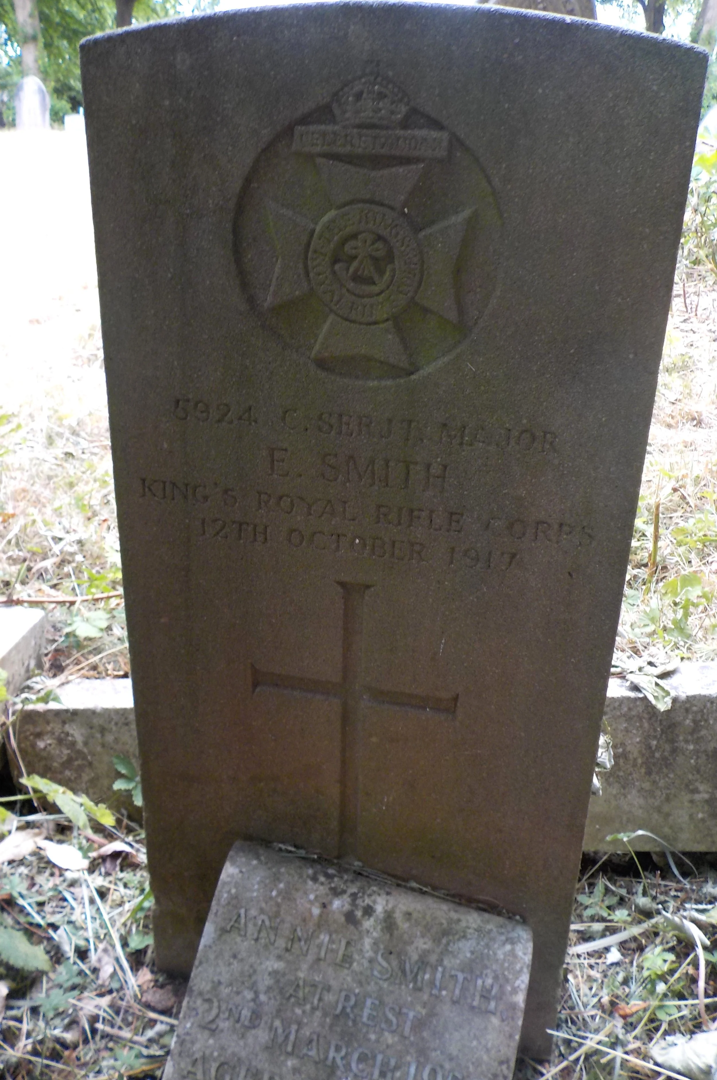 Died 12/10/1917 Age 27. Company Serjeant Major, King's Royal Rifle Corps, 7th Bn. Service Number 5924. Husband of Annie Smith, of 44, Camp St., Derby.