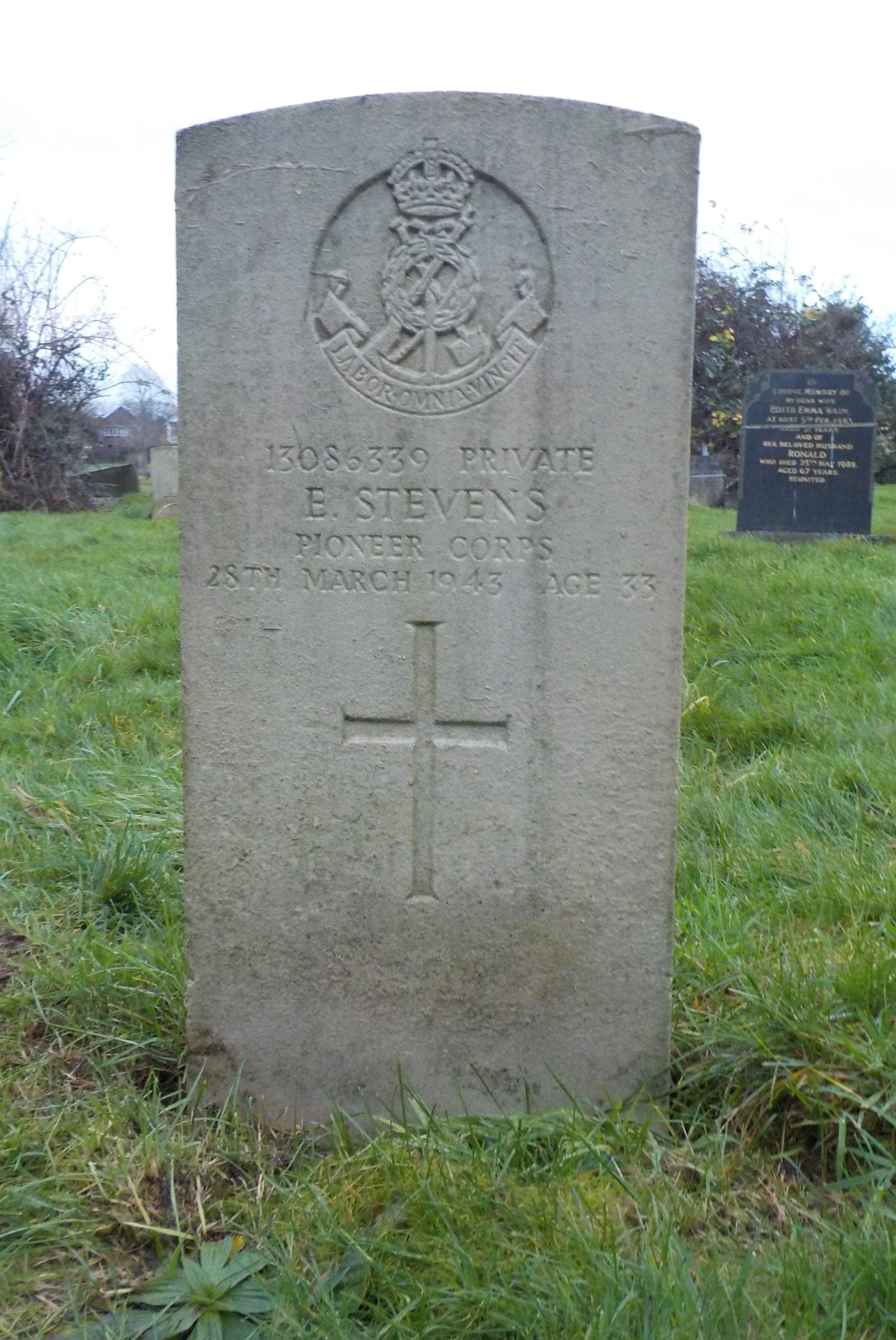 Died 28/03/1943 Age 33. Private, Pioneer Corps, Service Number 13086339. Husband of M.E. Stevens, of Ockbrook.