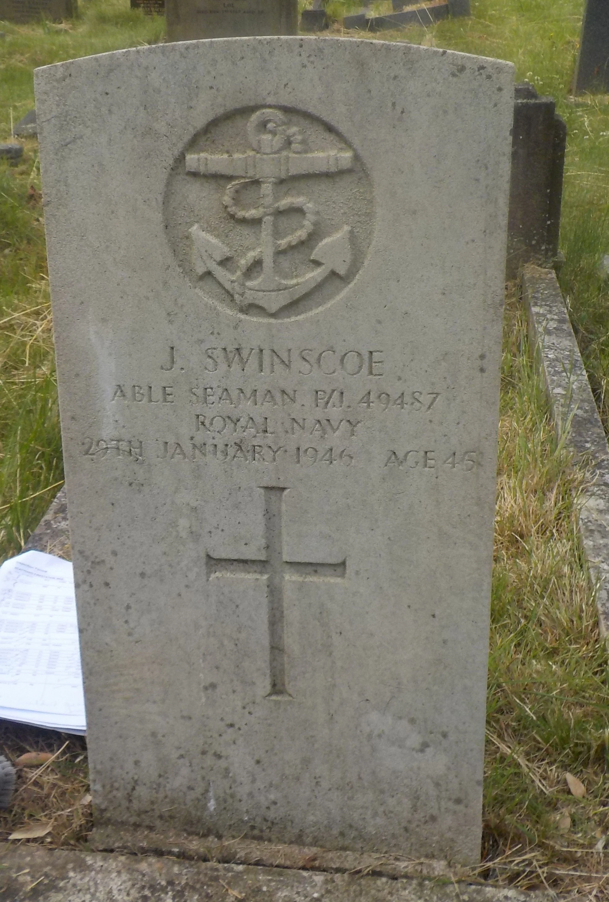 SWINSCOE, John. CH/PM. WW2. CWGC.Died 29/01/1946 Age 45. Able Seaman, Royal Navy, Service Number P/J49487.