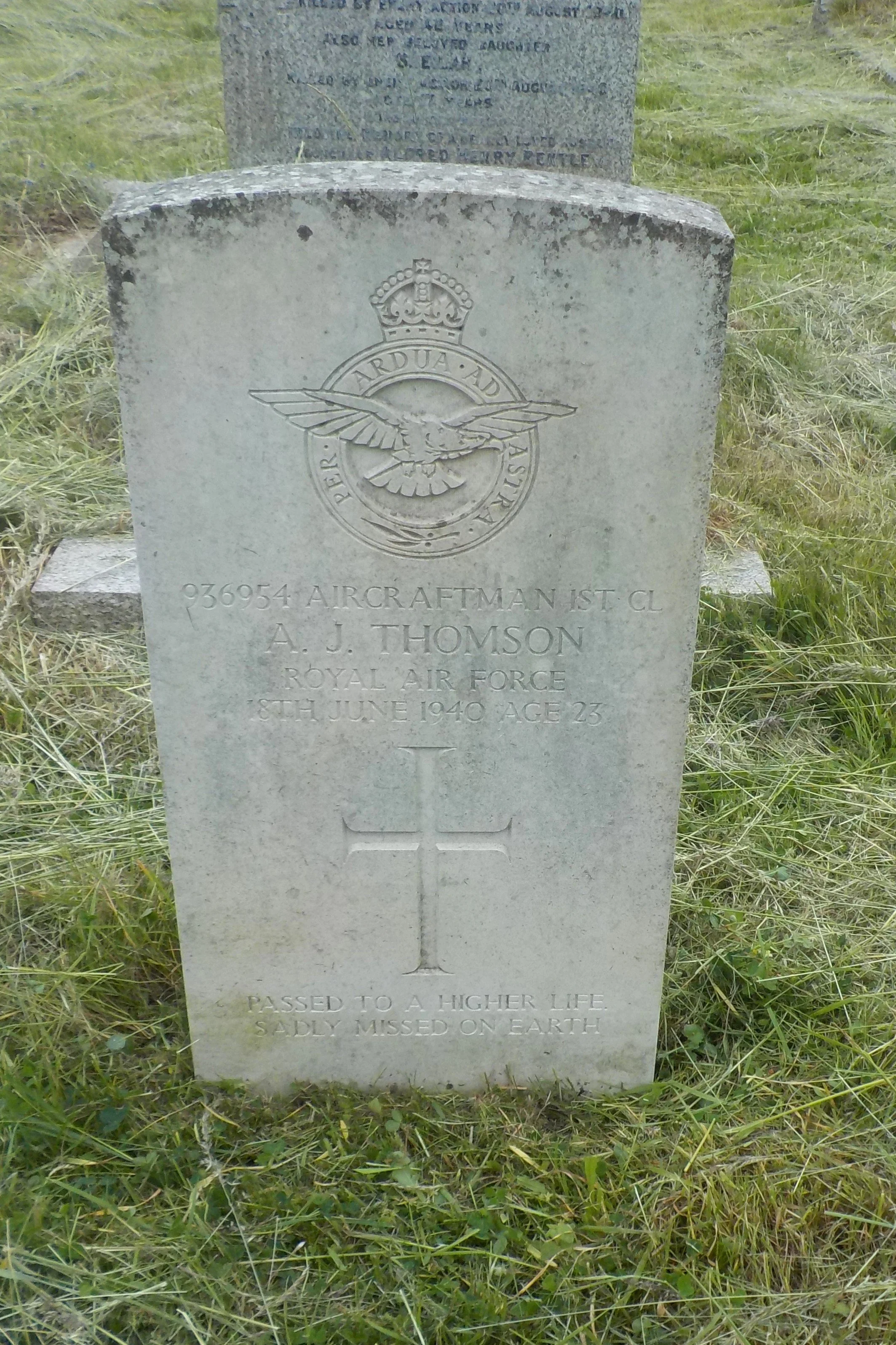 Died 18/06/1940 Age 23. Aircraftman 1st Class, Royal Air Force Volunteer Reserve, Service Number 936954. Son of William and Bella Orr Thomson; husband of Dorothy Hilda Thomson, of Derby.