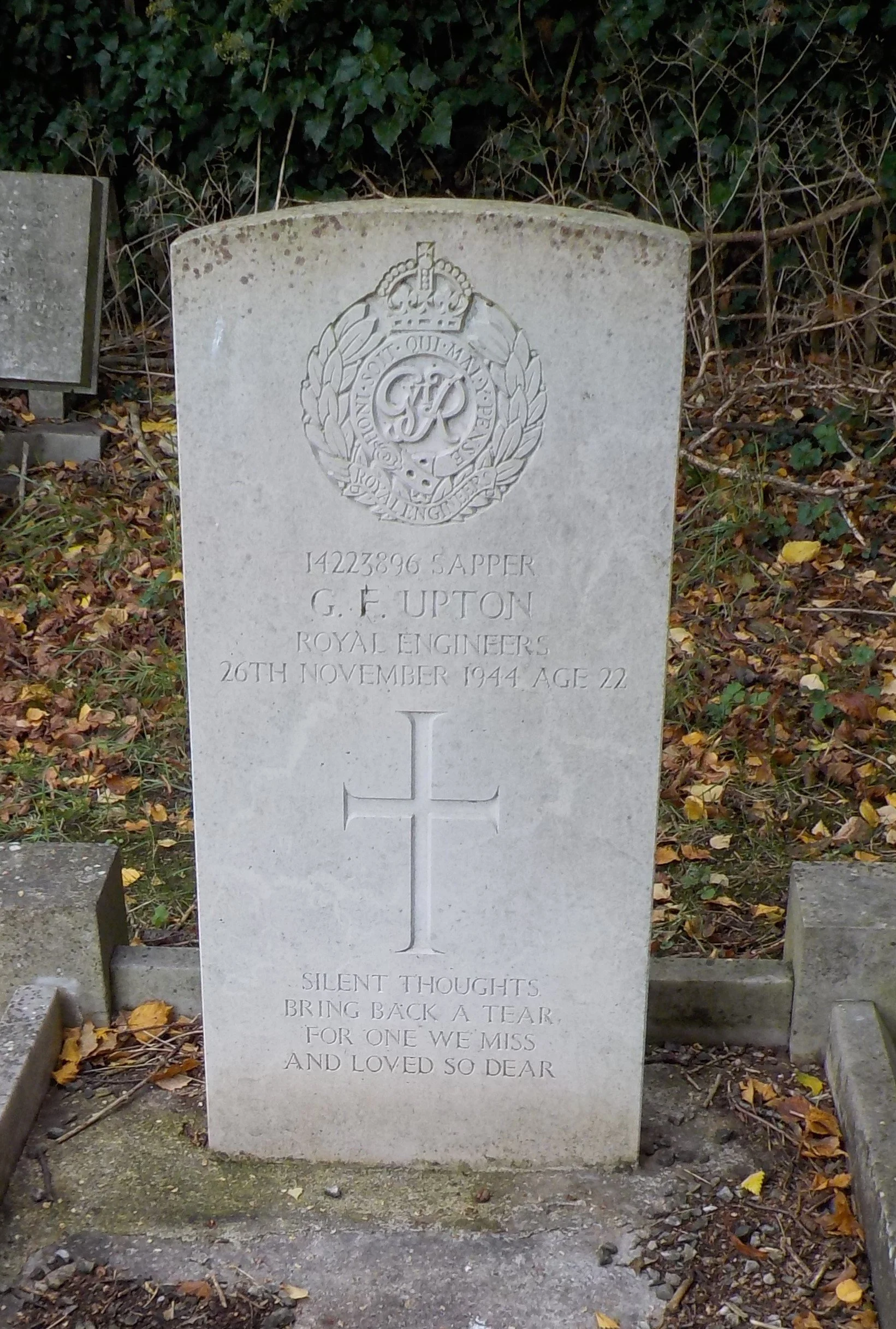 Died 26/11/1944 Age 22. Sapper, Royal Engineers, Service Number 14223896. Son of Sidney George and Alice Upton, of Derby.