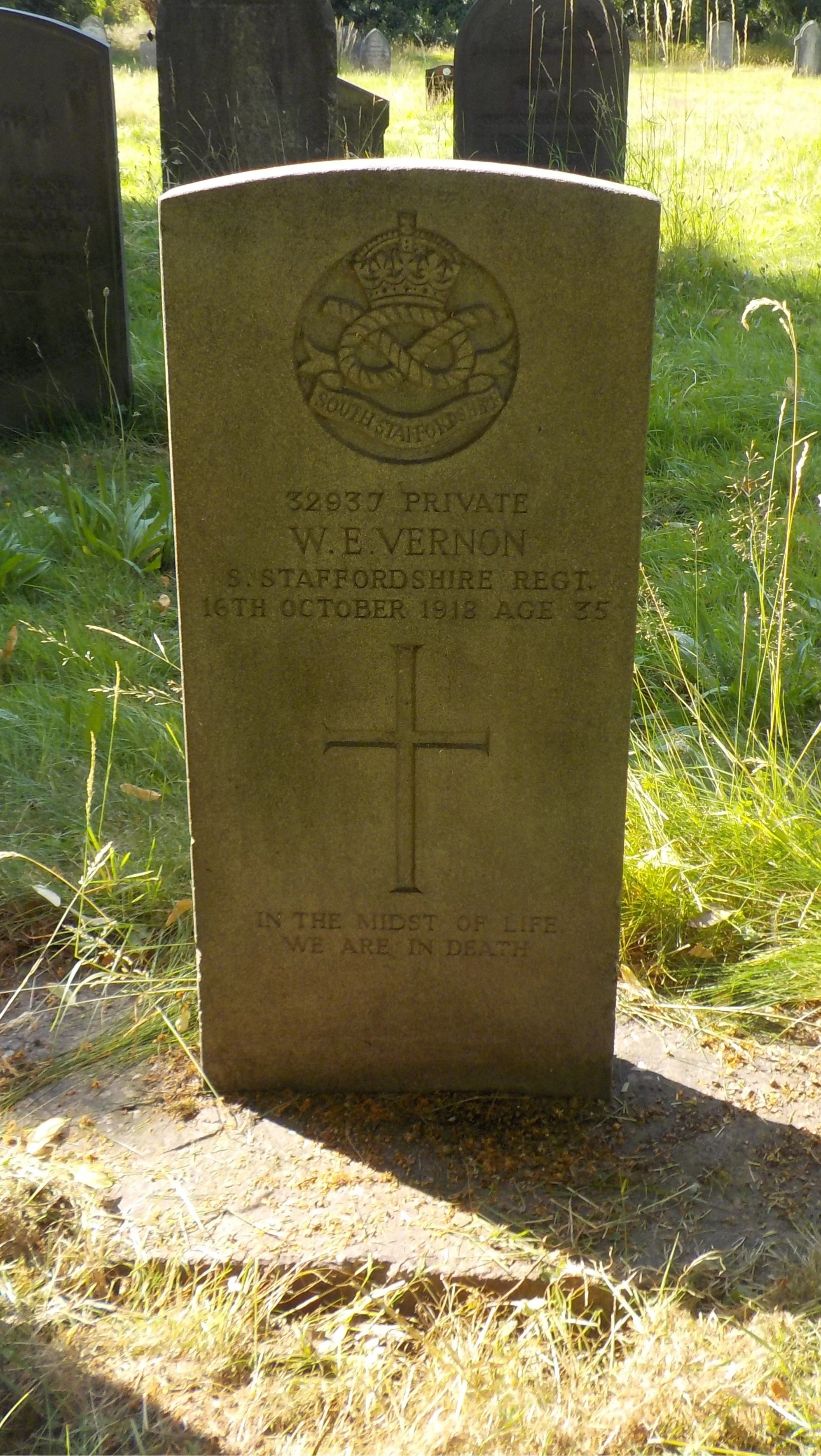 Died 16/10/1918 Age 35. Private, South Staffordshire Regiment, 5th Reserve Bn. Service Number 32937. Son of Mr. W. and Mrs. H. Vernon, of Derby; husband of Elizabeth Florence Vernon, of 44, Moss St., Derby.