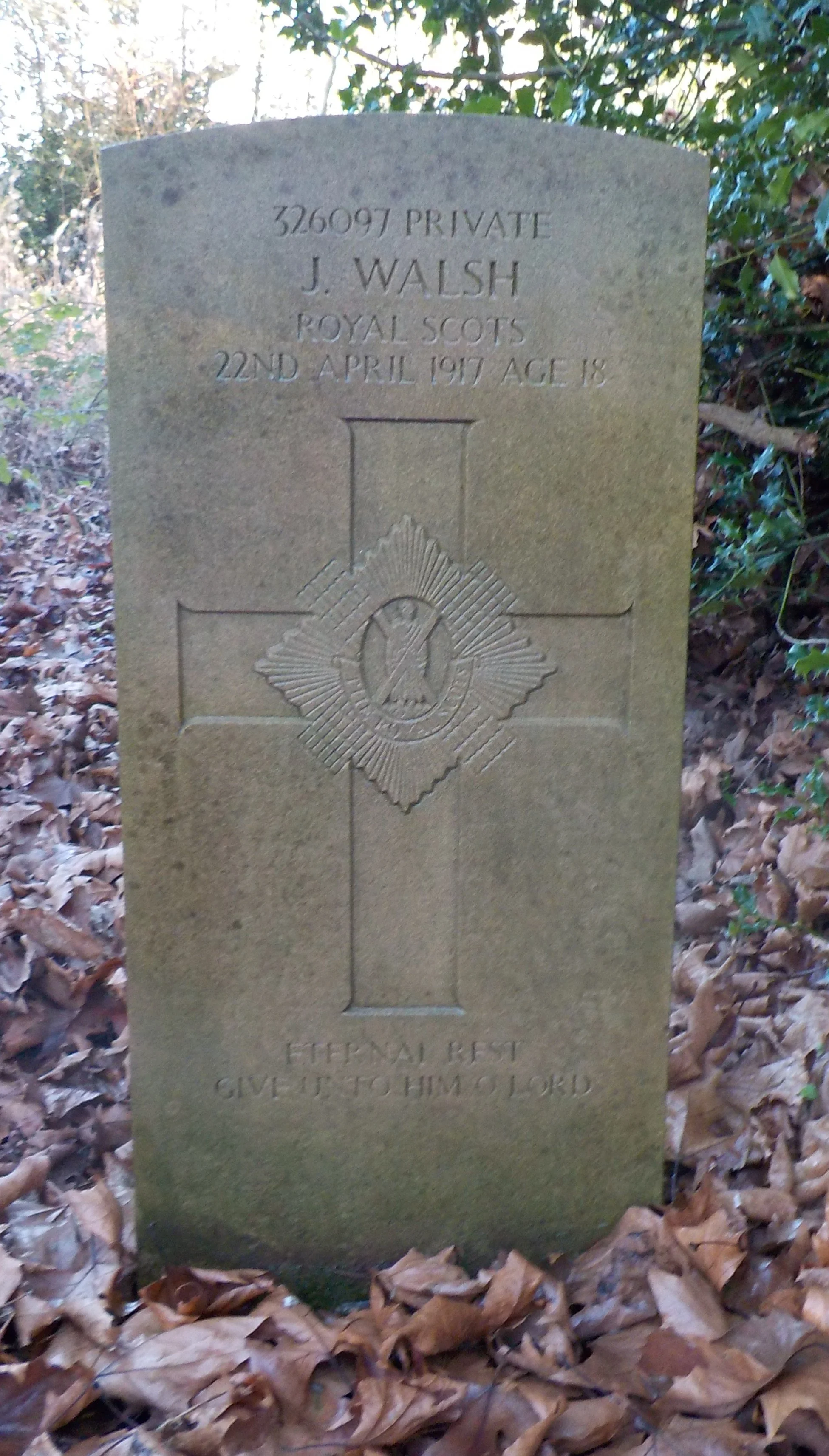 Died 22/04/1917 Age 18. Private, Royal Scots, 8th Bn. Service Number 326097. Son of Mr. T. and Mrs. F. Walsh, of 34, Arnold St., Derby.