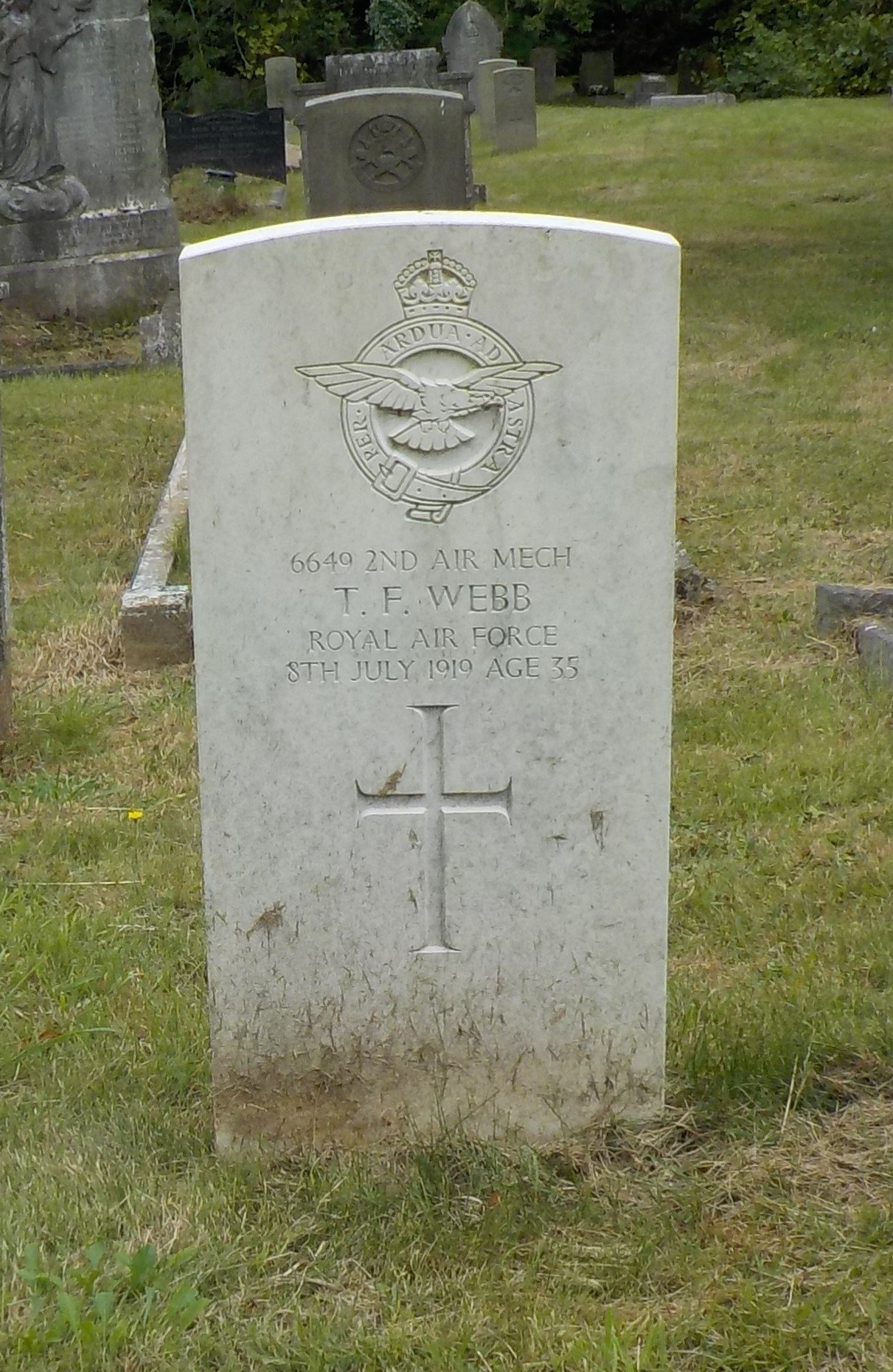 Died 08/07/1919 Age 35. Air Mechanic 2nd Class, Royal Air Force, Service Number 6649. Son of E. T. and F. Webb; husband of R. G. Webb, of Hillmorton, Ashford, Derbyshire. Born at Charfield, Bristol.