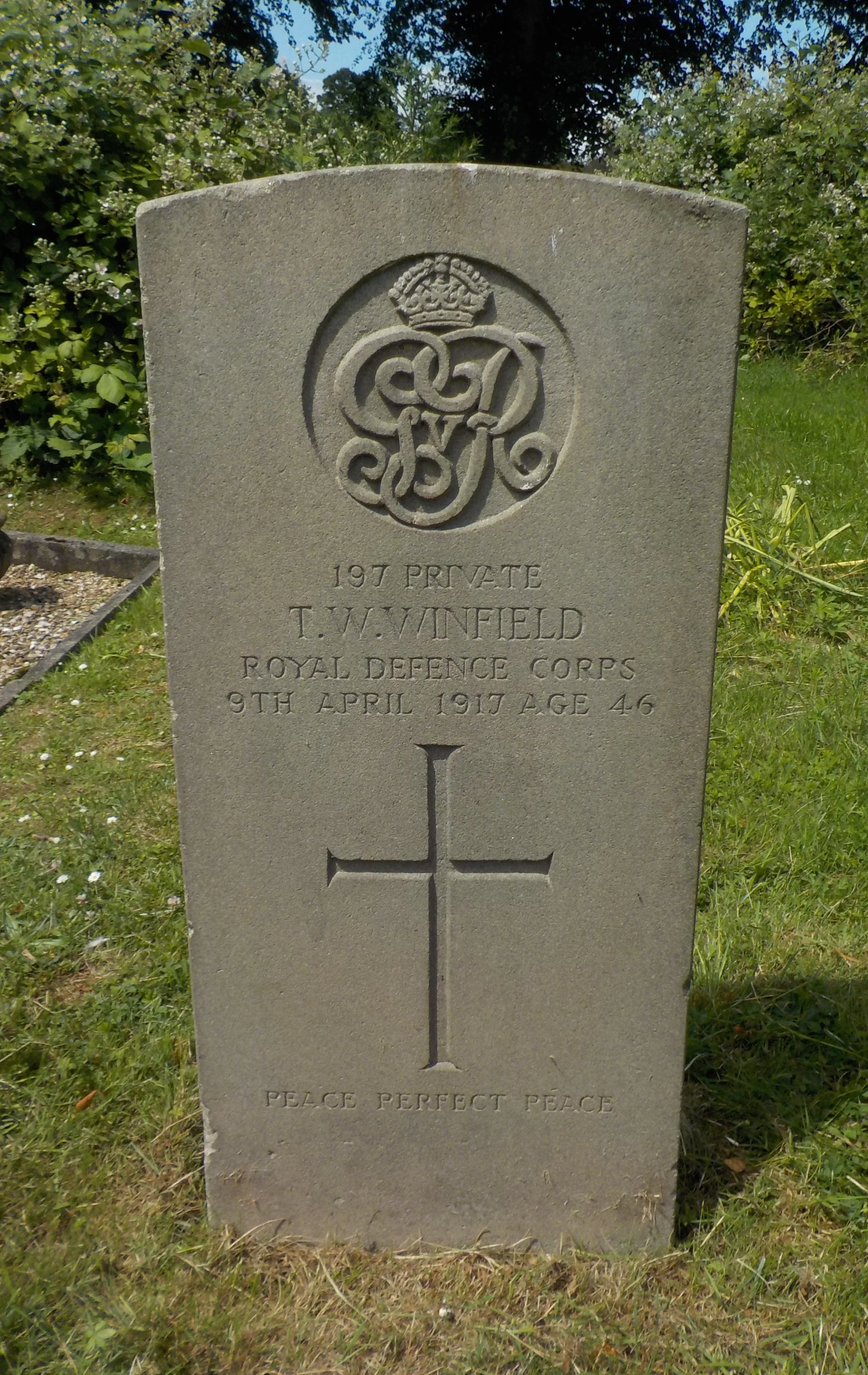 Died 09/04/1917 Age 46. Private, Royal Defence Corps, 151st Protection Coy. Service Number 197. Husband of Sarah Ellen Winfield, of 47, Peach St., Derby.
