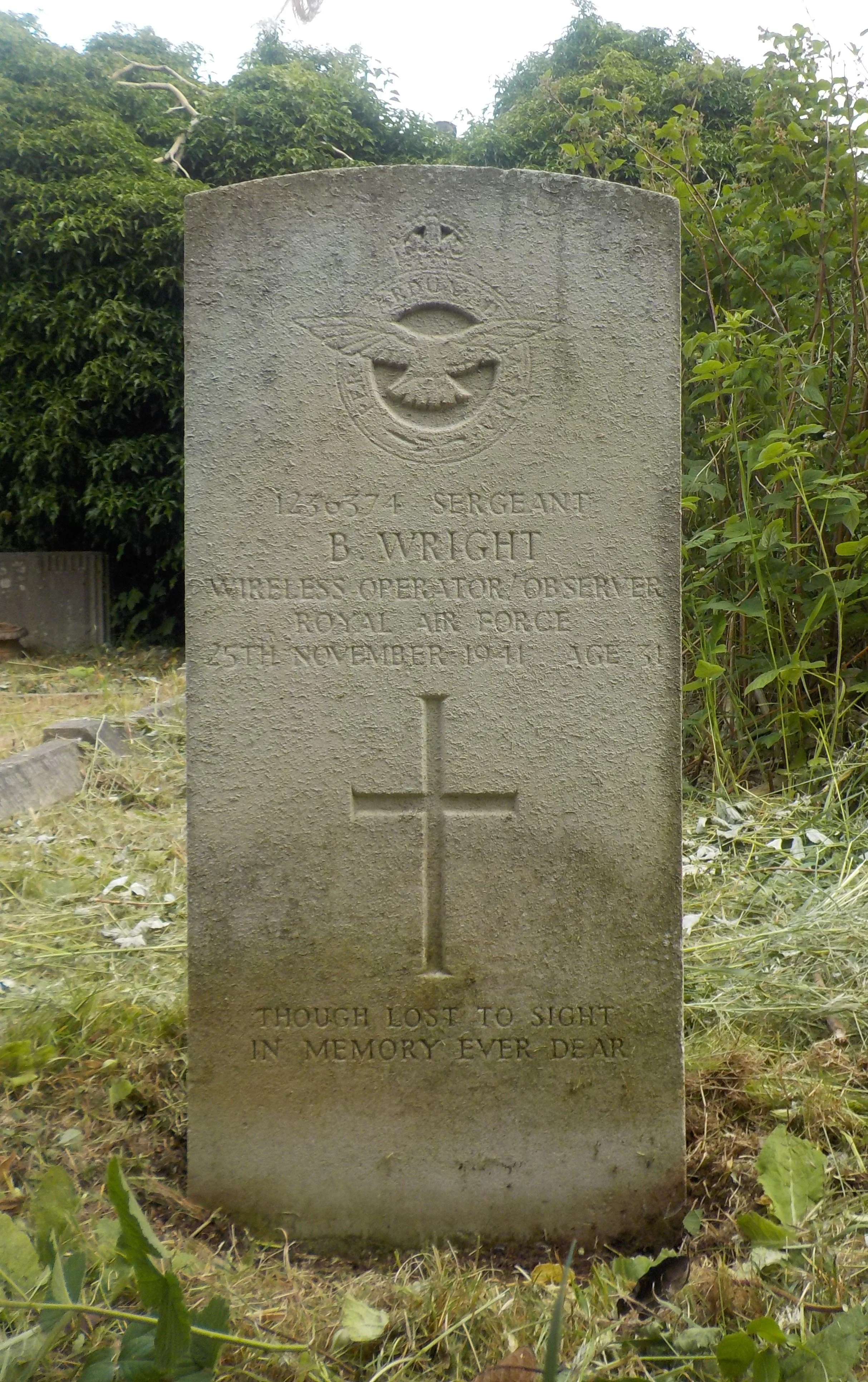 Died 25/11/1941 Age 31. Sergeant, Royal Air Force Volunteer Reserve, Service Number 1236374. Son of Benjamin and Mary Wright; husband of Marjorie Wright, of Littleover, Derby.