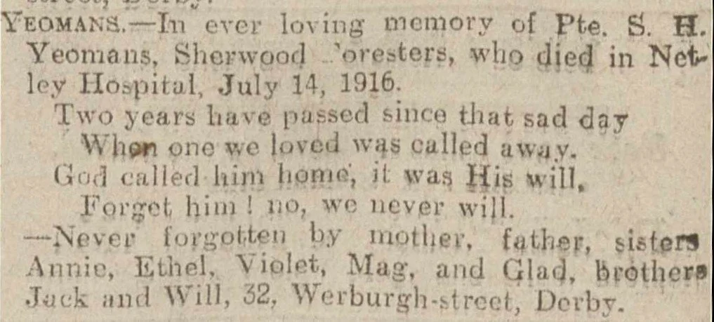 Died 14/07/1916 Age 25. Private, Sherwood Foresters (Notts and Derby Regiment), 1st/5th Bn. Service Number 2355. Son of Samuel and Betsy Yeomans, of 32, Werburgh St., Derby. Died at Netley Hospital.