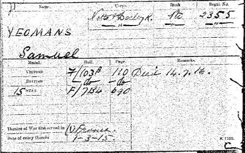 Samuel YEOMANS was awarded the 1914-15 Star Medal, the Victory Medal and the British War Medal.